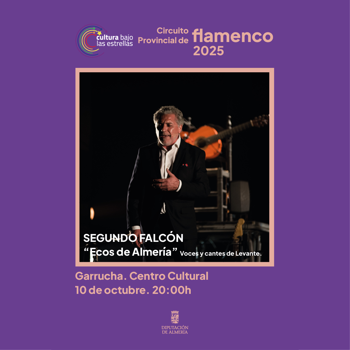 Este proyecto rinde homenaje a los grandes cantaores de Almería y a los cantes de levante, figuras legendarias de cantaores como El Ciego de la Playa o Pedro el Morato. El espectáculo explora los cantes mineros y de levante, la malagueña de Chacón, la soleá y los tarantos que cobran vida en un recorrido sonoro y visual por el alma del flamenco almeriense. La guitarra flamenca de David de La Fragua, fiel a las tonalidades y afinaciones tradicionales, acompaña a los cantes interpretados por Segundo Falcón. “Ecos de Almería” no solo rescata el legado de estos grandes maestros, sino que también reivindica la importancia de Almería en el desarrollo del flamenco, poniendo en valor su singularidad dentro de legado flamenco andaluz.